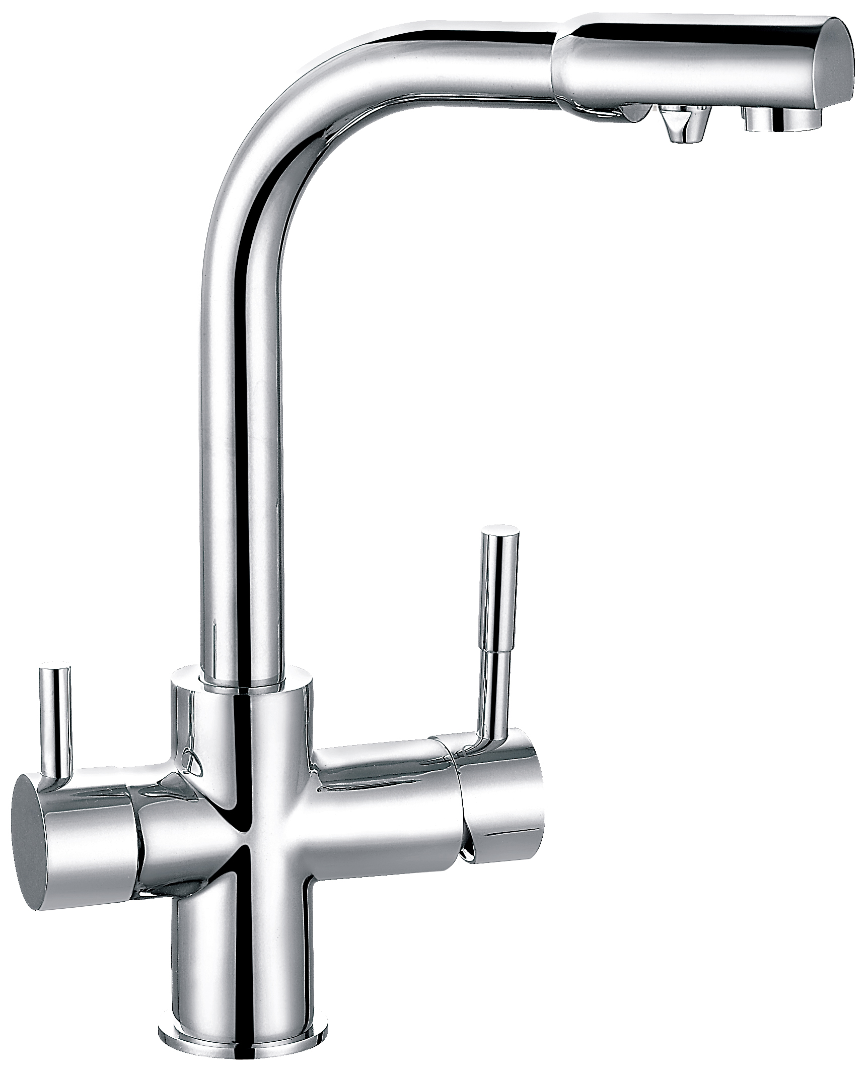 Кран чистой воды DF-0921 устанавливается на кухне для подачи потребителю как магистральной холодной и горячей воды, так и очищенной воды из системы фильтрации. Поворотная ручка отвечает за смешивание холодной и горячей воды. Дивертер на противоположной стороне крана обеспечивает выбор типа воды, которая будет подаваться через кран потребителю. Подключение крана осуществляется при помощи гибкой трубки для очищенной воды и гибких подводок.