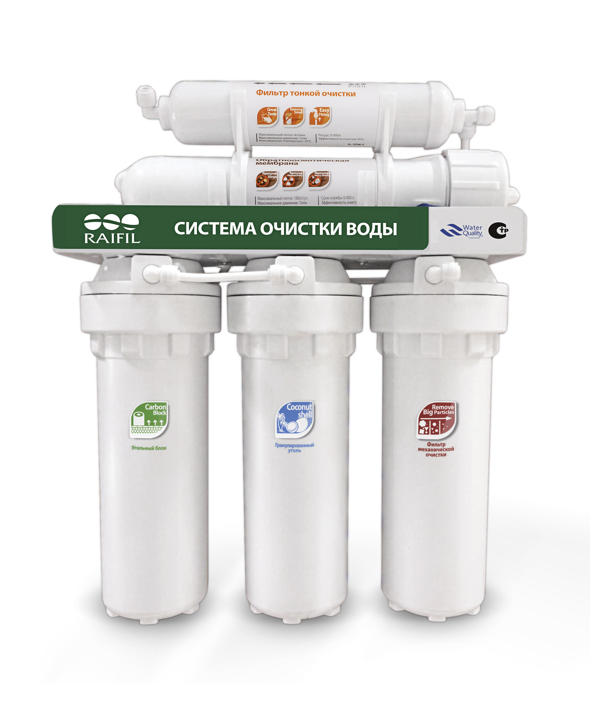 1-я стадия: механический фильтр 2-я стадия: фильтр с гранулированным кокосовым углем 3-я стадия: фильтр из спрессованного кокосового угля 4-я стадия: обратноосмотическая мембрана 220 л/сутки 5-я стадия: угольный фильтр тонкой очистки