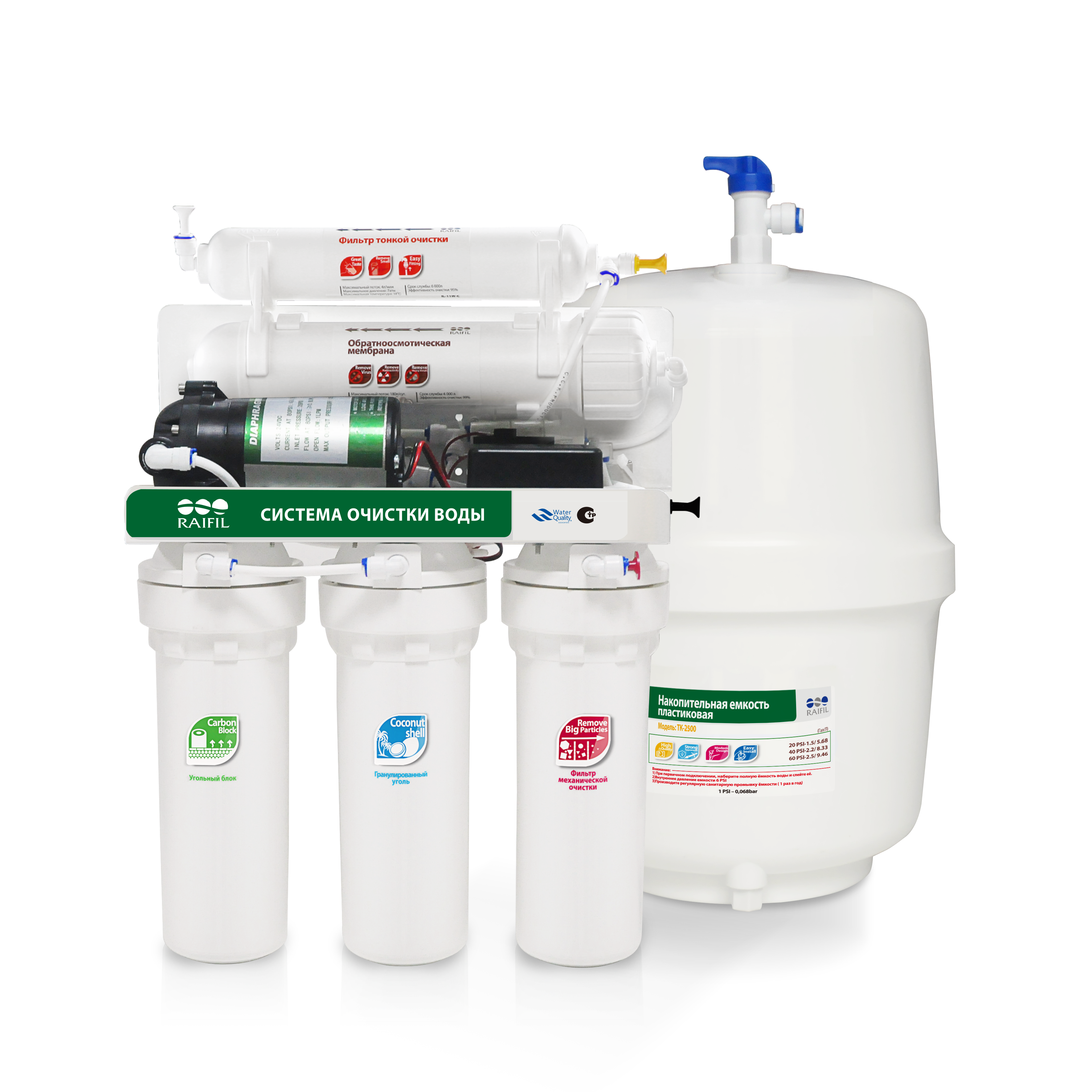 1-я стадия: механический фильтр 2-я стадия: фильтр с гранулированным кокосовым углем 3-я стадия: фильтр из спрессованного кокосового угля 4-я стадия: обратноосмотическая мембрана 220 л/сутки 5-я стадия: угольный фильтр тонкой очистки